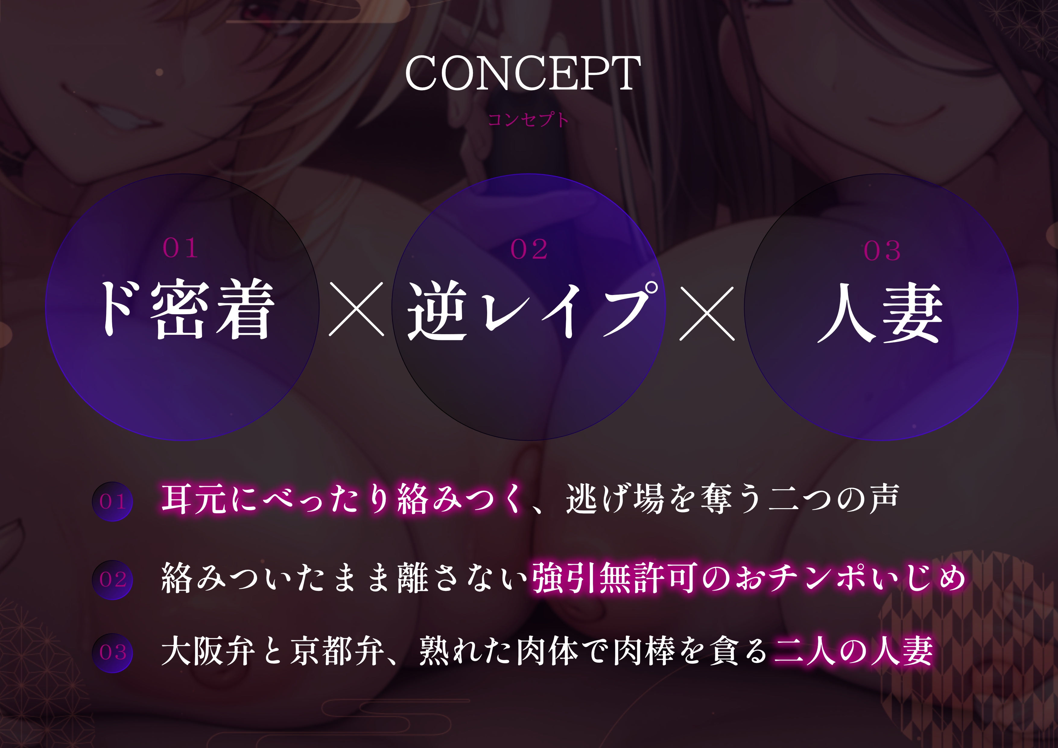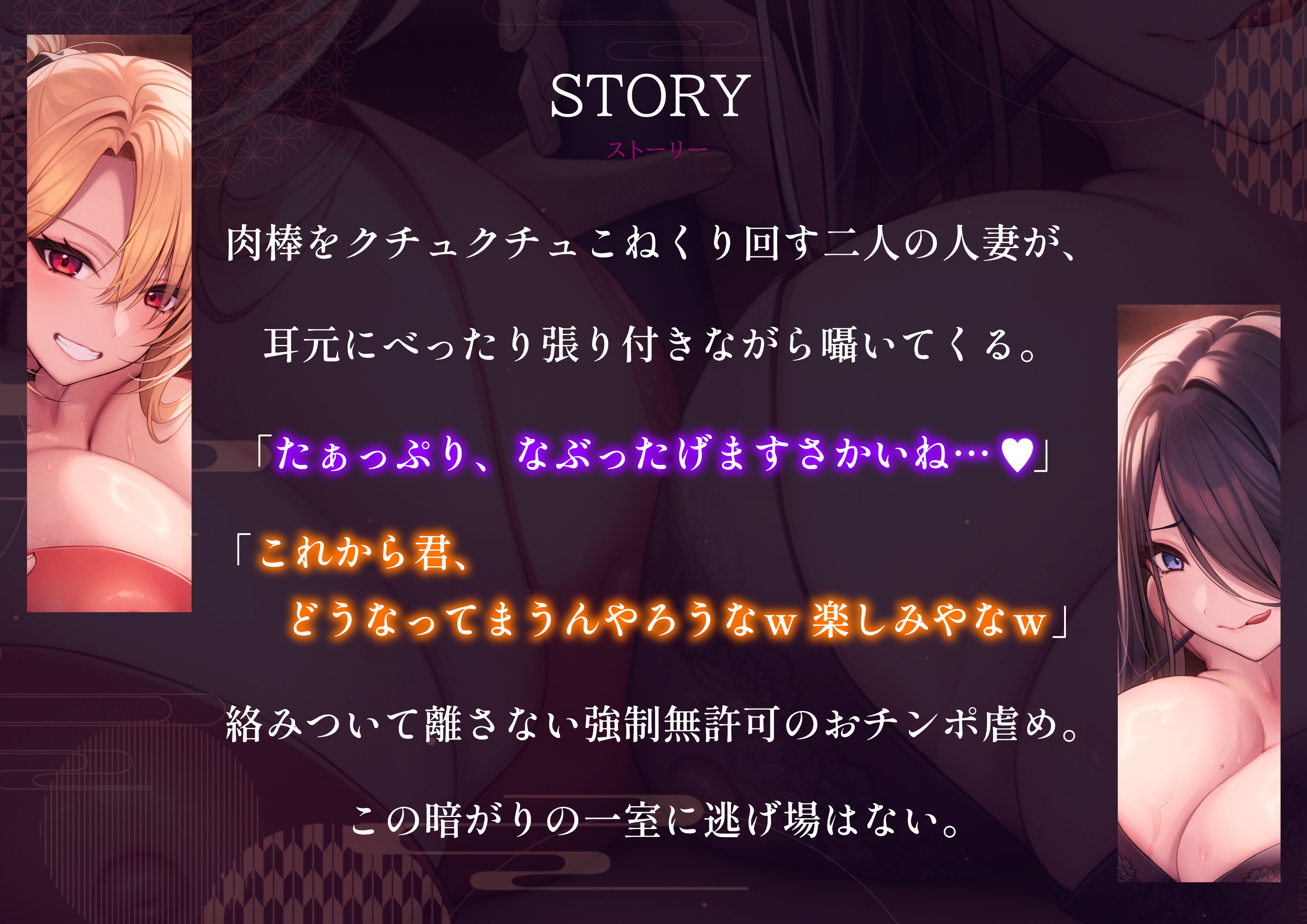 【DLsite専売ゲーム】【密着×逆レ〇プ】ホテル連れ込みW人妻 ~ダーク系京都弁と陽キャ系大阪弁人妻による耳元密着焦らし責め~(RJ01570810)サンプル画像【泡の夢】