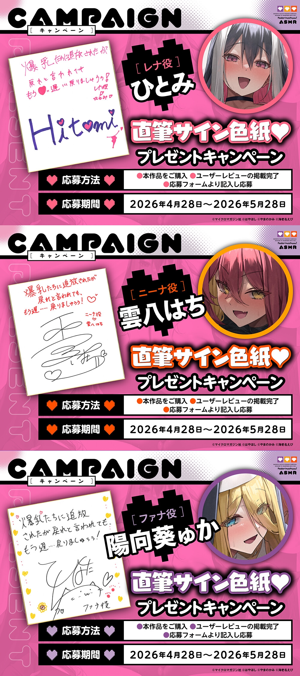 | 声優 | ひとみ 陽向葵ゅか 雲八はち |