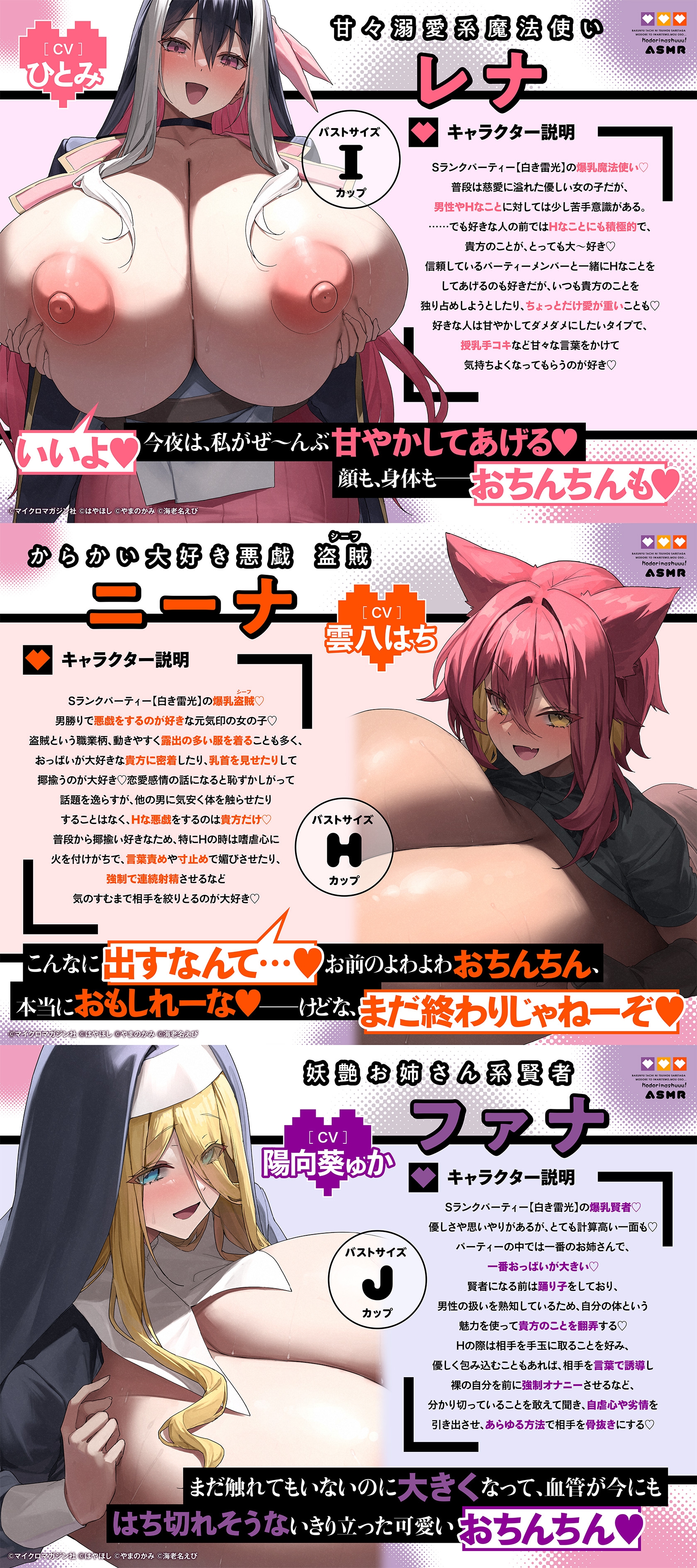 【2.5時間×爆乳×3人ハーレム】甘々おっぱいに負けちゃえ♡ ~大きなおっぱいによわよわなボクと甘々責々なSランク爆乳冒険者達による、秘密のドスケベおっぱい特訓♡~(RJ01600467)はサークル名:MM社のDLsite専売同人ボイス・ASMR作品です。