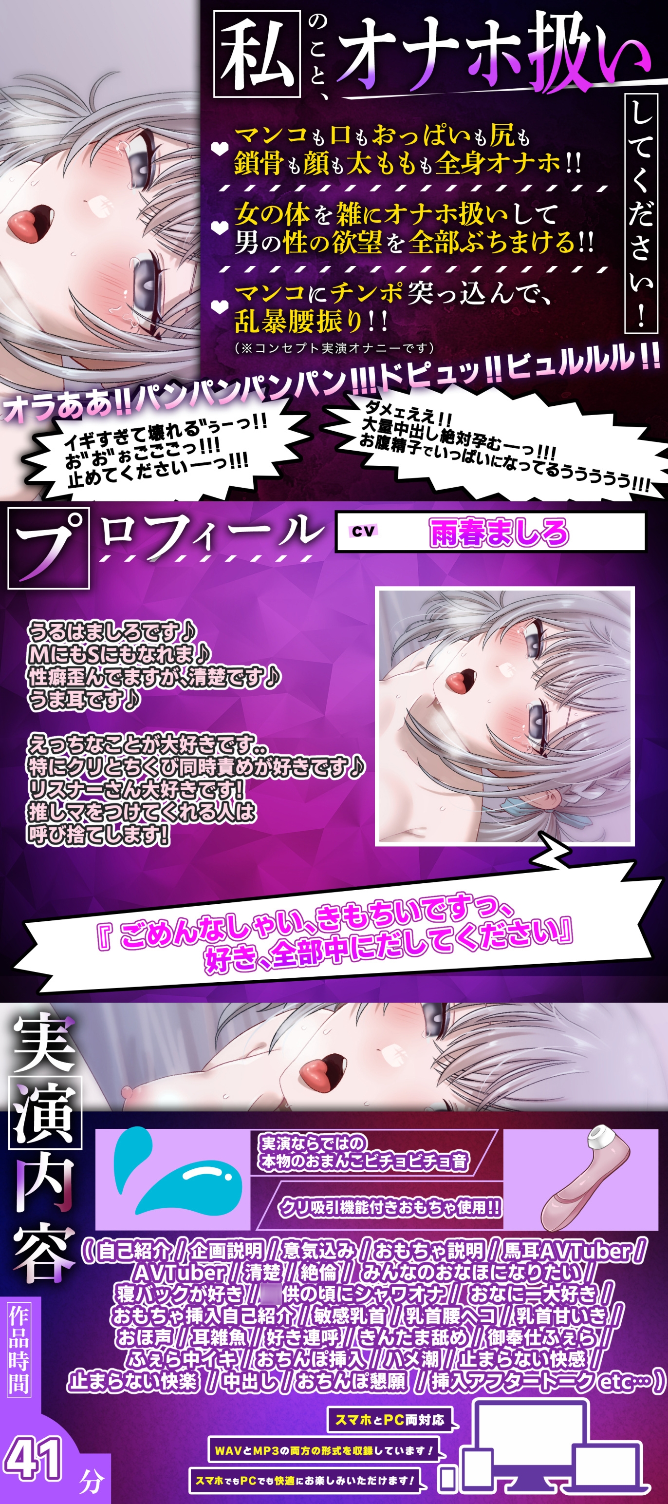 【実演オナニー】オナホ扱いしてください!大人気AVtuber「雨春ましろ」さん初出演!!『おまんこ壊れぢゃう…びちょびちょになっちゃった……んぉおっ!!』(RJ01600968)はサークル名:実演オホ声の同人ボイス・ASMR作品です。