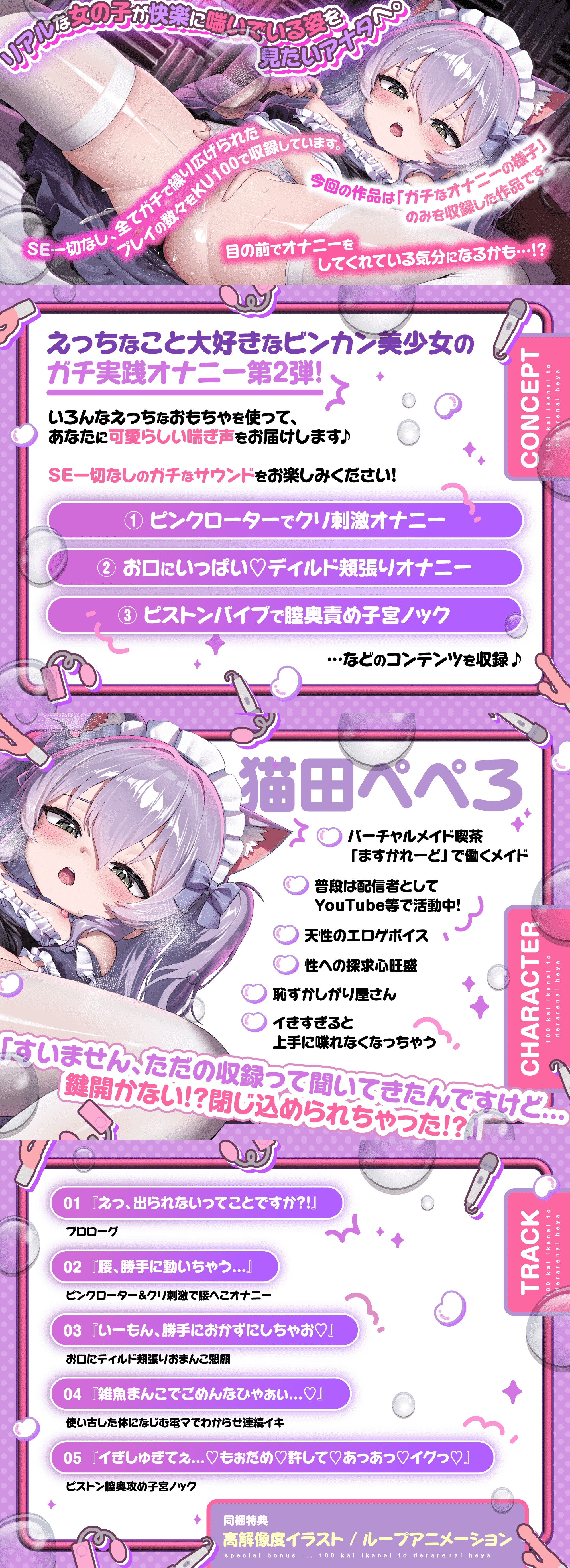 ガチ実演!ガチイキ!100回イかないと出られない部屋(RJ01603591)はサークル名:バーチャルメイド喫茶『ますかれーど』のDLsite専売同人ボイス・ASMR作品です。