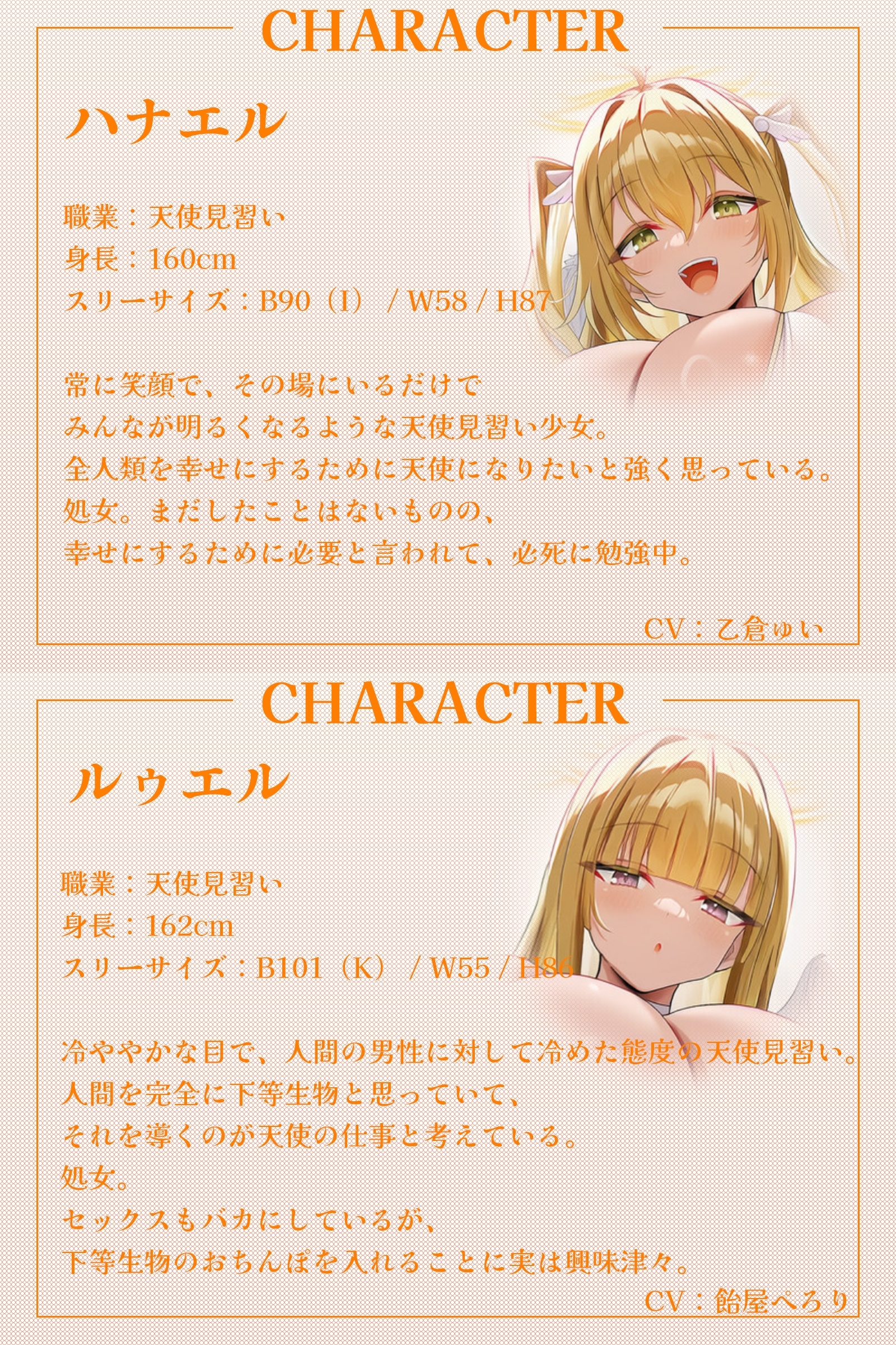 天使昇格試験はあなたのおちんぽ!?~甘々天使とクール天使、二人の処女を奪うご奉仕中出しハーレム~【KU100収録】(RJ01610966)はサークル名:才色兼ビッチの同人ボイス・ASMR作品です。