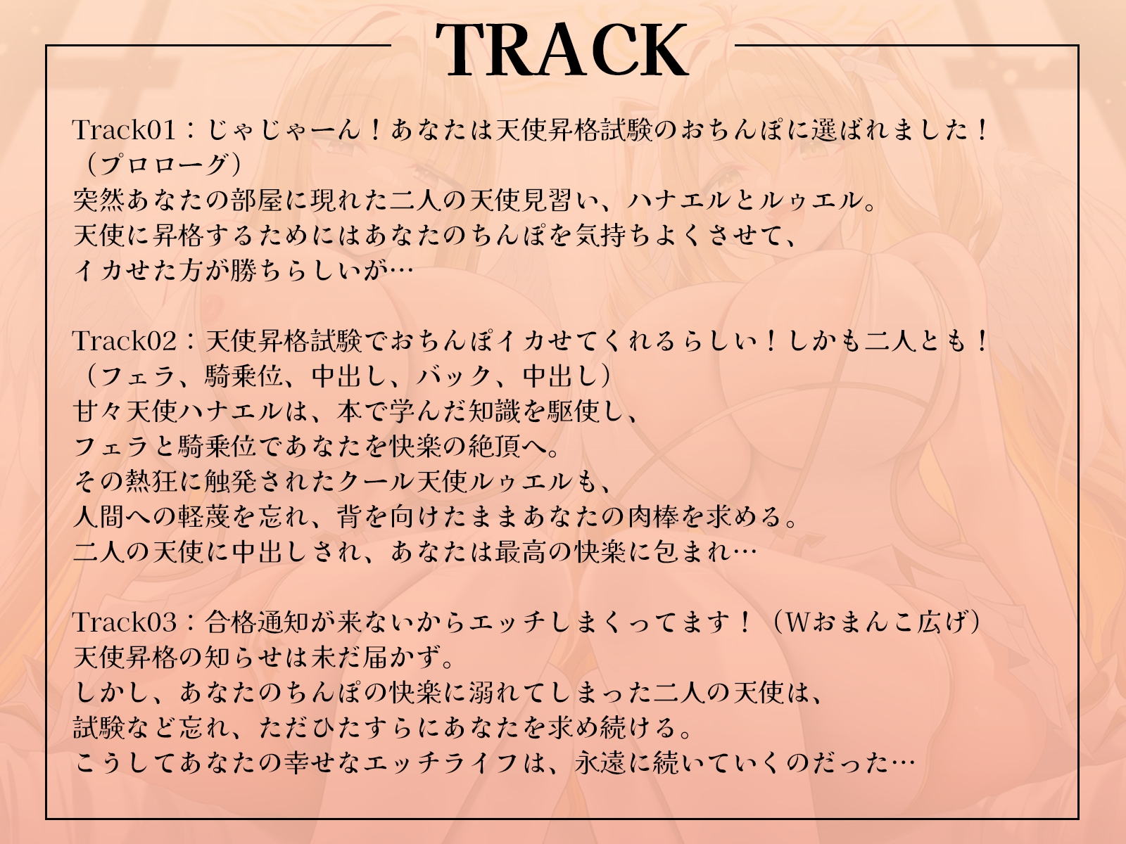 【ゲーム】天使昇格試験はあなたのおちんぽ!?~甘々天使とクール天使、二人の処女を奪うご奉仕中出しハーレム~【KU100収録】(RJ01610966)内容まとめ【才色兼ビッチ】